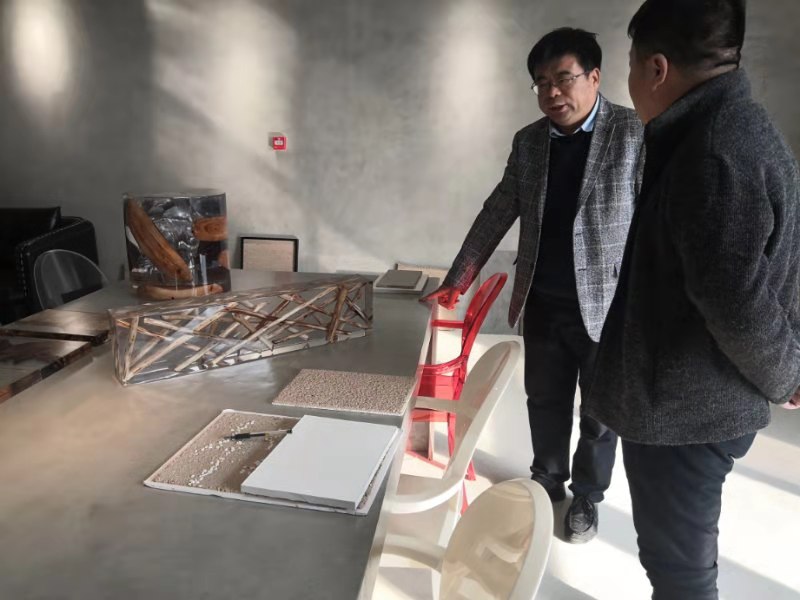 離開協會辦公室,到協會產品研發大廳進行參觀、交流。展廳展示了不同砂漿配制的地坪砂漿,根據設計、客戶要求,利用不同級配的砂子,做出不同的砂漿產品,特別是高檔地坪、高檔裝飾砂漿產品,這樣把砂漿變成了藝術,改變了砂漿冰冷的感覺,有了生活藝術氣息,提高了產品品味。馮總根據不同的砂漿,也介紹了“馮氏砂子級配分析法”應用技術,如何根據產品的特點,調整砂子級配,做出藝術感更強的產品。