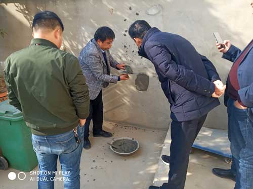 根據機制砂的級配情況,馮教授很快設計出砂漿配方,砂漿很快配制出來,經過檢測,一切指標合格,特別是砂漿的施工性特別好,能夠滿足大工施工的要求,這樣,可以大大降低砂漿的成本,增加預拌砂漿的市場競爭力。馮總邊演示砂漿的檢測方法,邊給大家講解機制砂砂漿的特點,可能出現的問題,解決的方法。同時,回答了大家提出的問題,介紹了明年預拌砂漿的發展方向。
